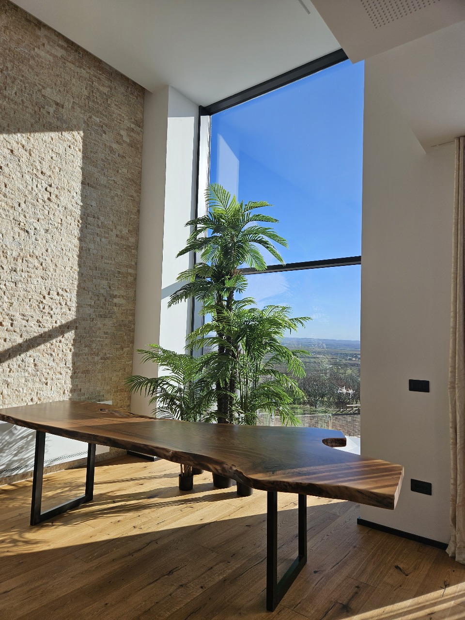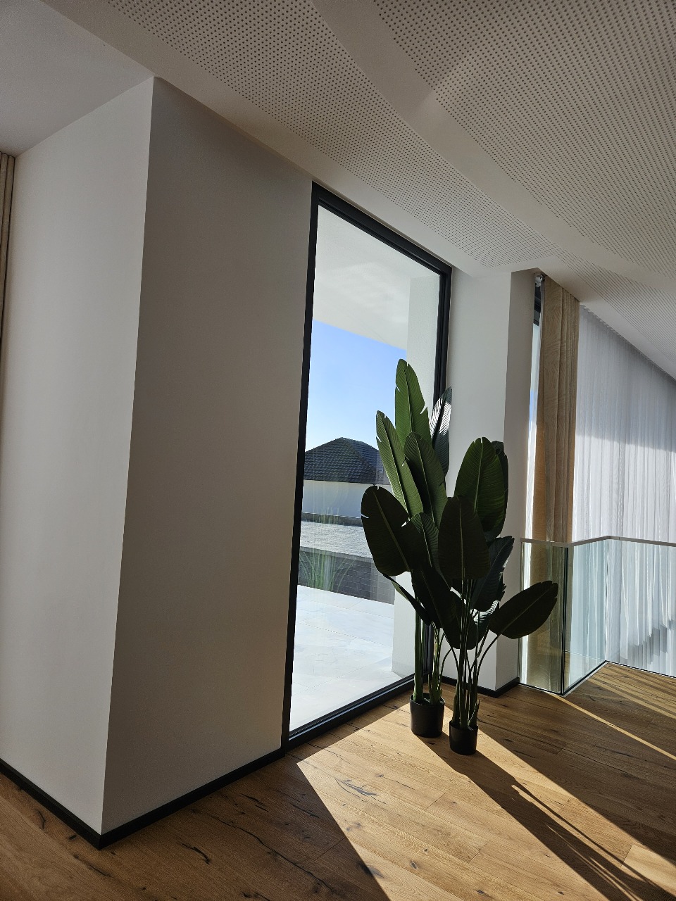 Pivot doors SD115 and sliding doors Supreme S700 provide maximum functionality and elegance in access, enhancing the space and ease of use throughout the villa. The façade is completed with high-performance doors and windows that improve energy efficiency and ensure optimal natural lighting.