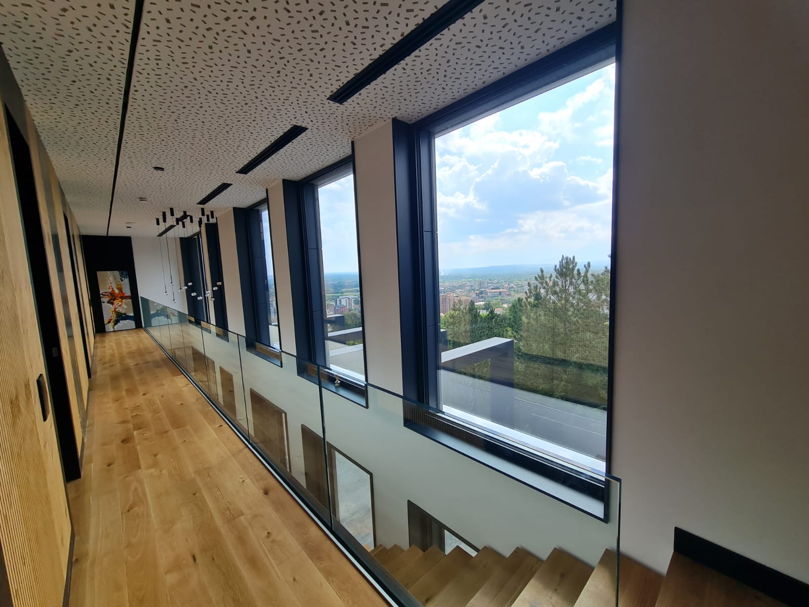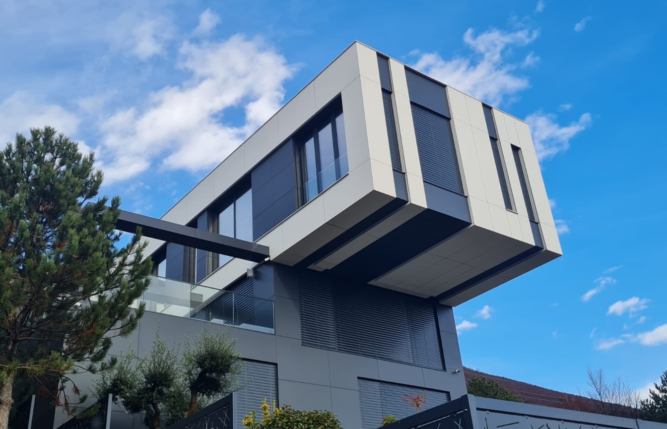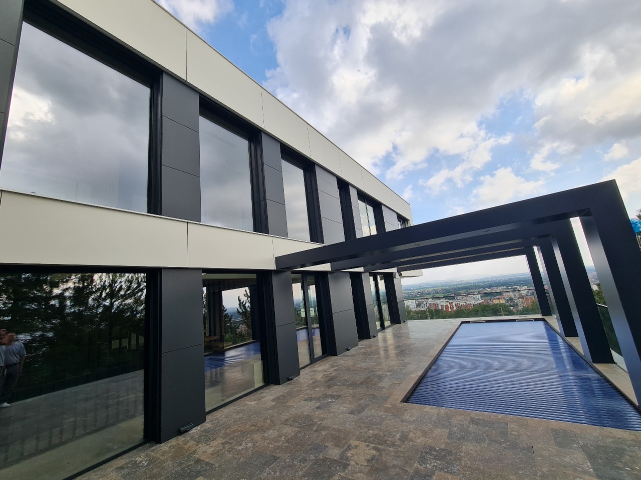 To optimize natural lighting while controlling solar heat gain, Guardian Glass Solar Clima Guard VSG laminated glass has been integrated, ensuring both safety and energy performance. For additional shading and privacy, the villa is equipped with Jalousine Z90 blinds, which allow flexible light control and enhance the building’s modern aesthetic.