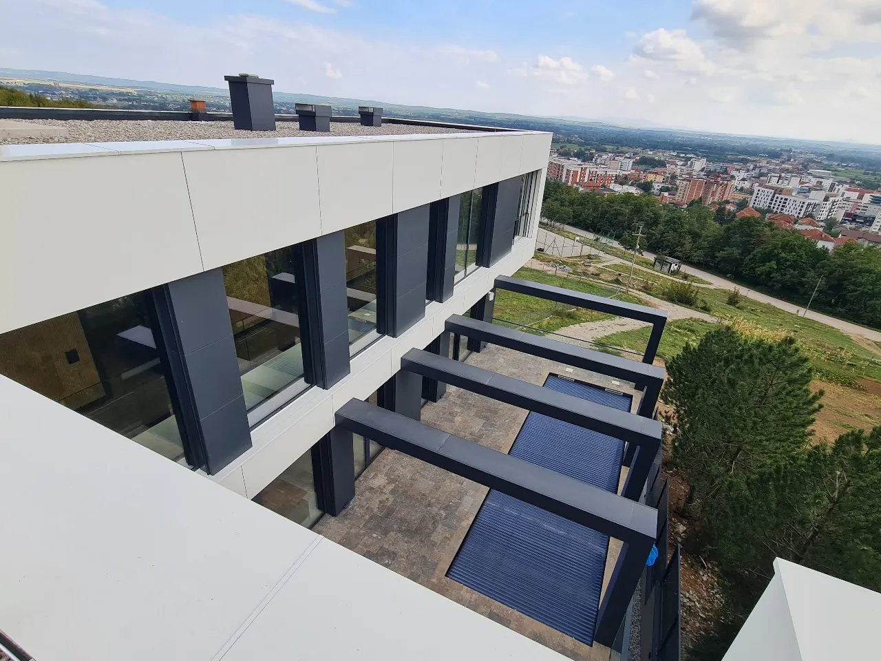 The use of Alumil M8250 glass railings provides elegant safety features for balconies and terraces, allowing unobstructed views while maintaining structural integrity. The ventilated façade system is engineered with premium Fundermax panels, fixed securely with Sika adhesives and insulated with 18 cm thick Rockwool material, which offers excellent thermal insulation, fire resistance, and sound dampening, significantly reducing energy consumption and increasing indoor comfort.